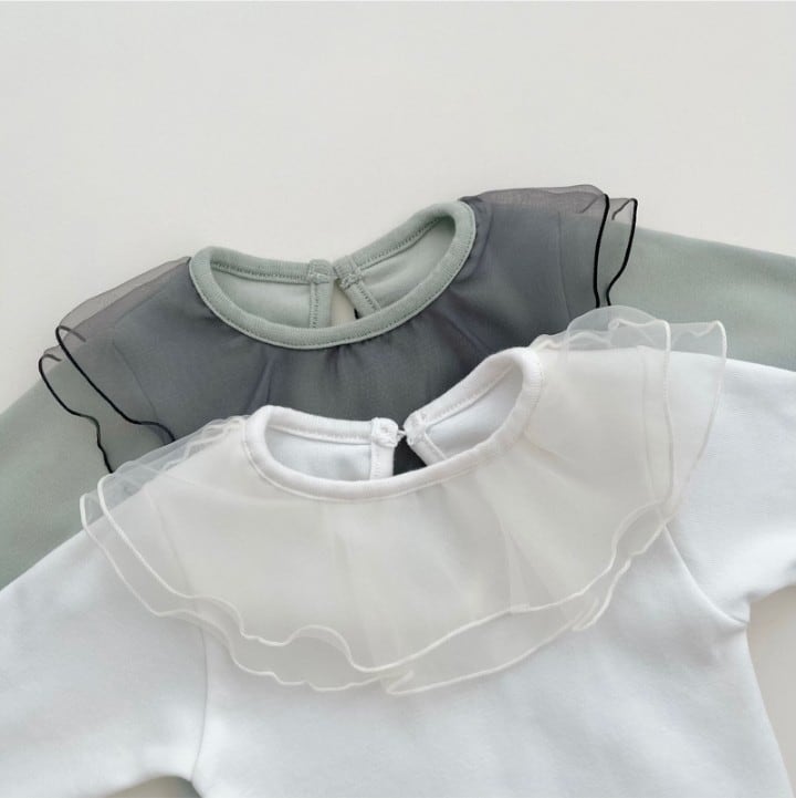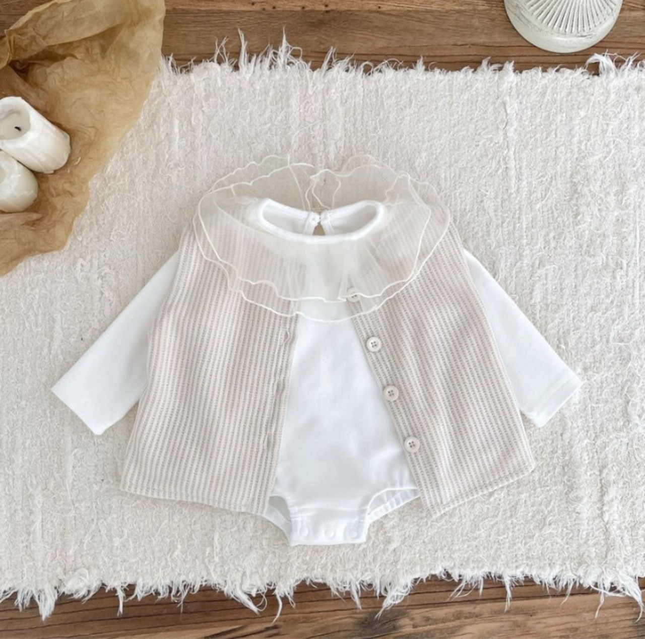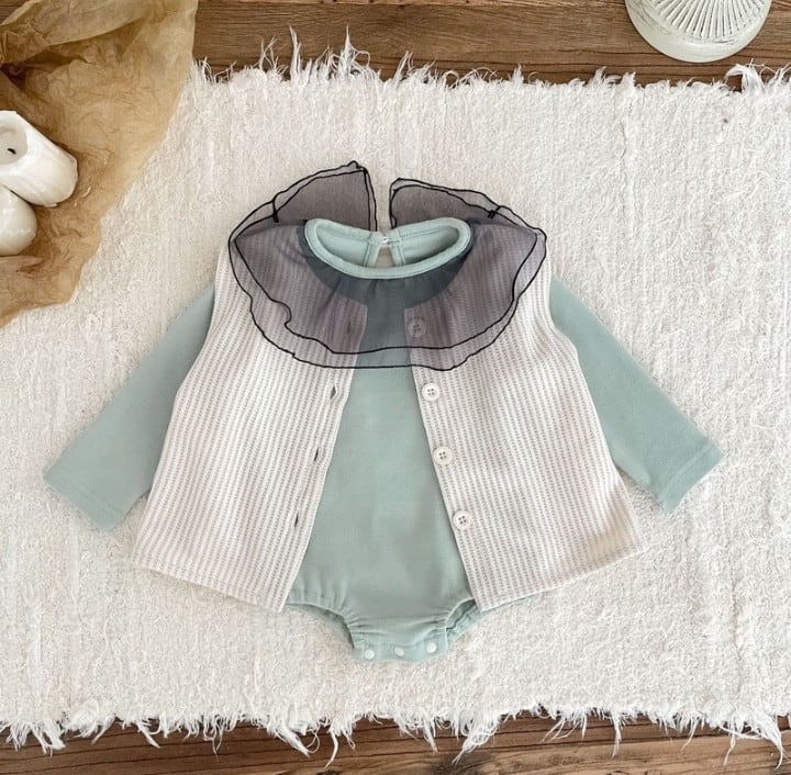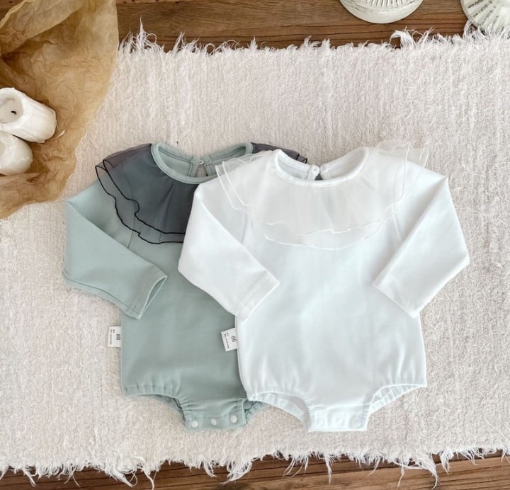 やわらかな生地で仕立てたロンパース。 襟のフリルがとても印象的で、お子さまの毎日を少し特別にしてくれる一枚です。