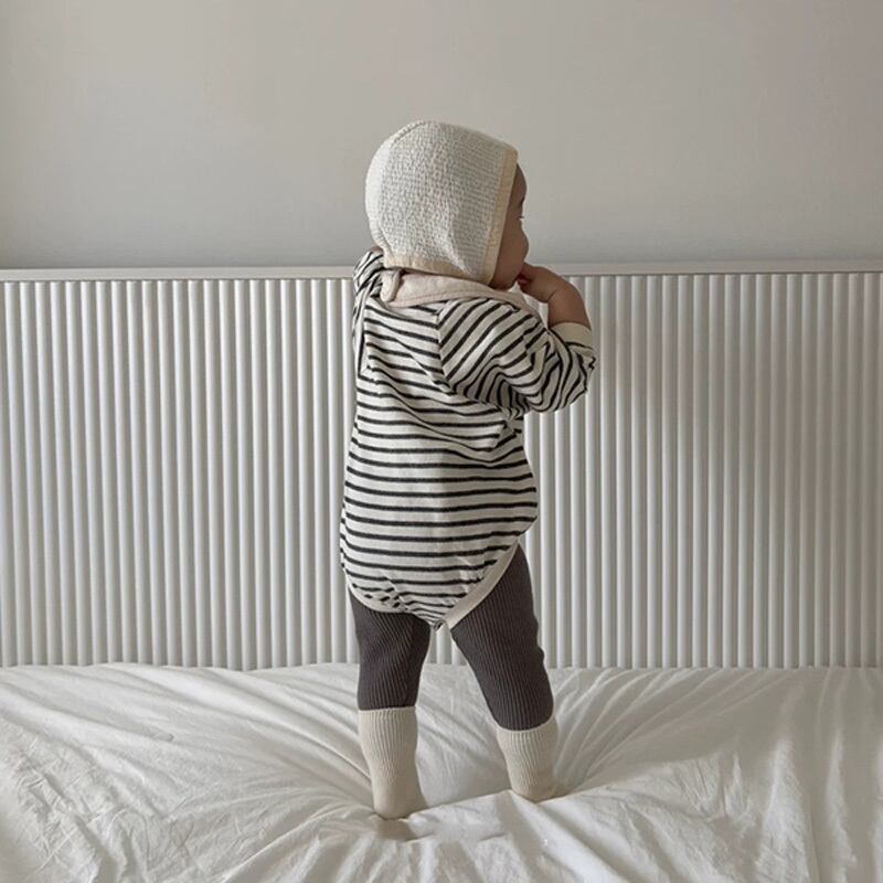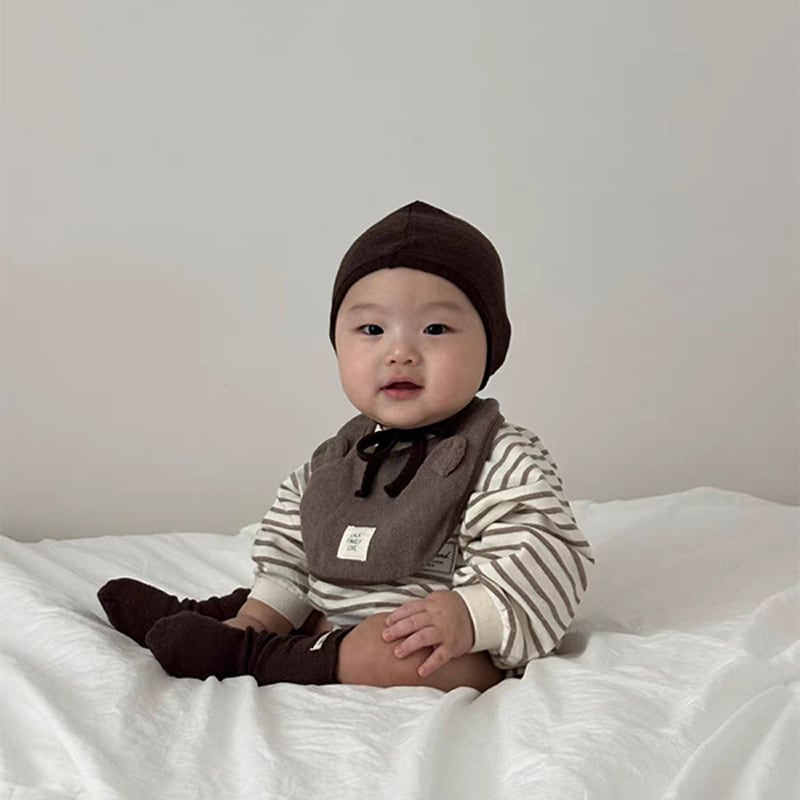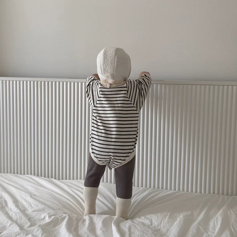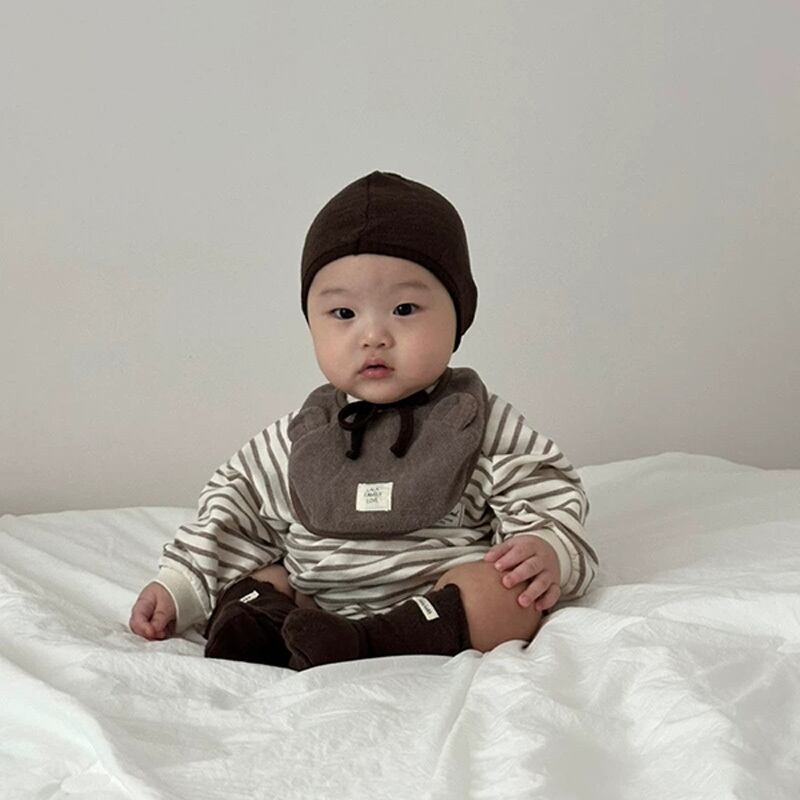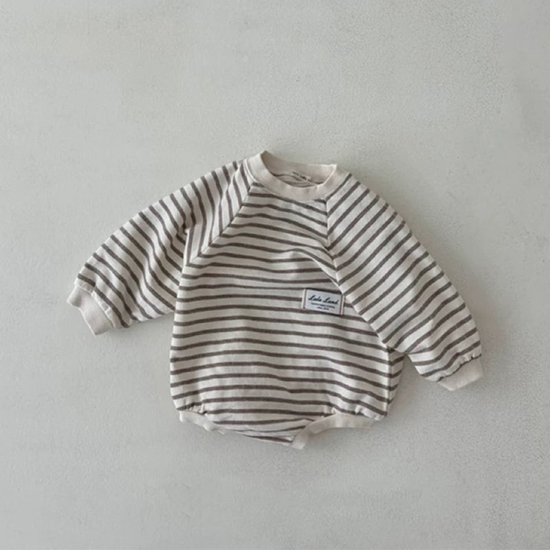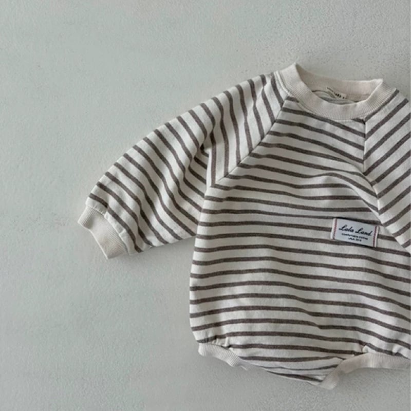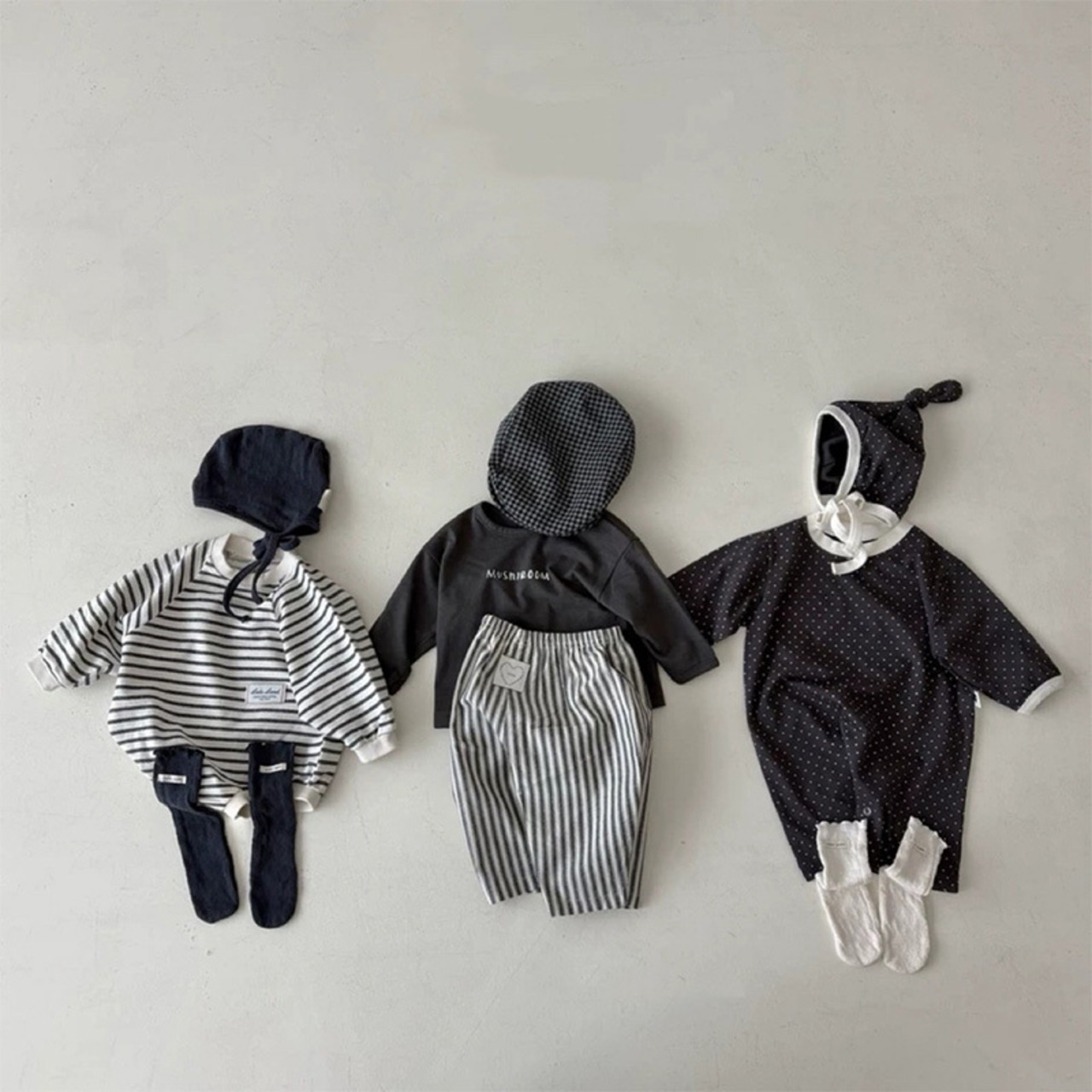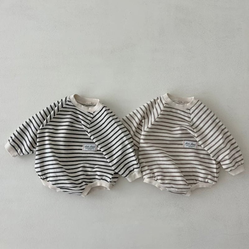 ボーダーのシンプルなロンパースですが、かたちや素材、ワンポイントまで計算された高見え要素満載です。これからベスト合わせたりカーディガンなどオリジナルの着こなししてください。