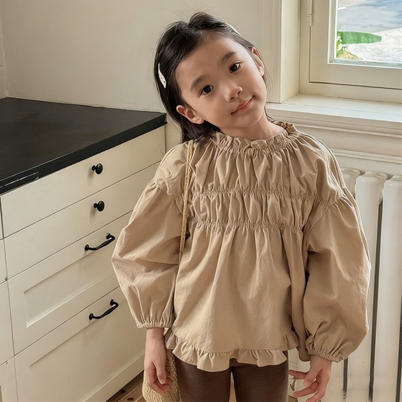 ギャザーがたっぷり入っている可愛いシャツ。甘さもありつつ都会的なスタイリッシュさもあるので、サロペット合わせやワイドパンツにも合います。