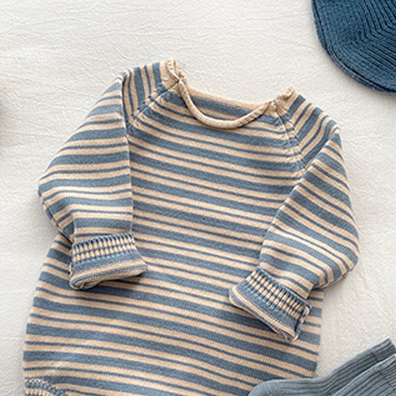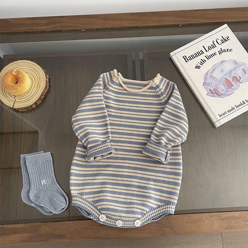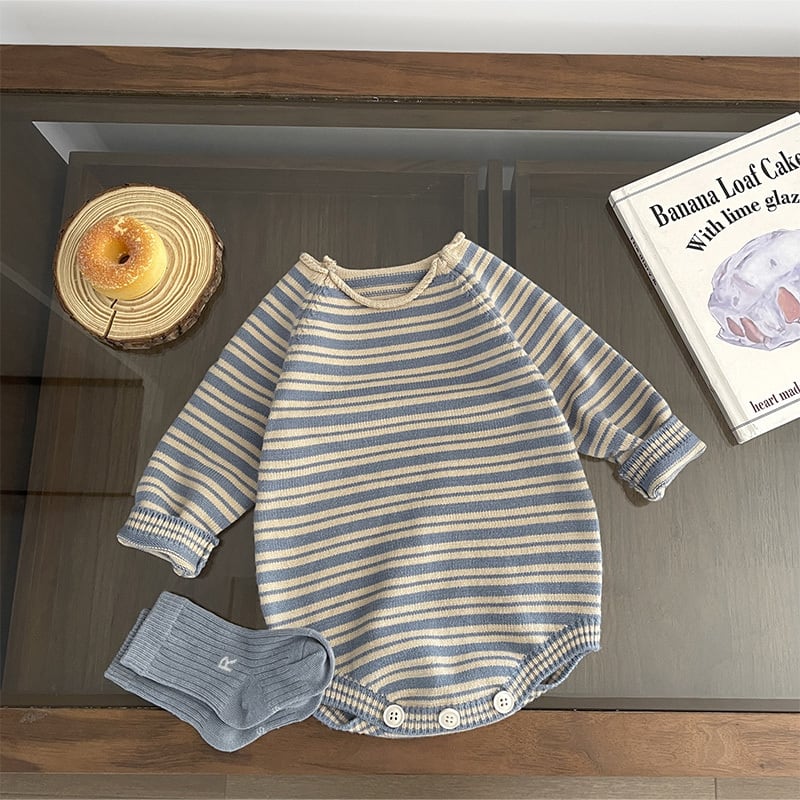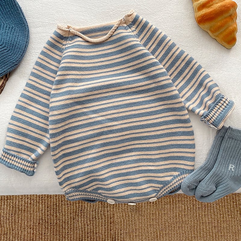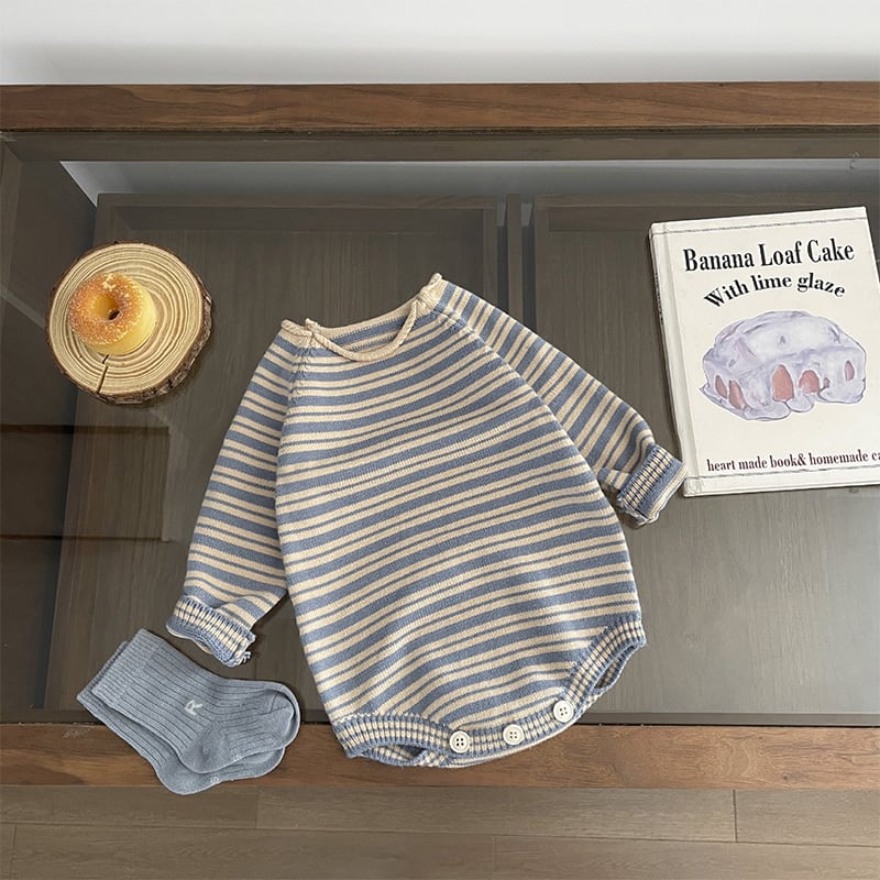 シンプルなボーダーですが、デザイン・シルエットが可愛いニットロンパース。小物でひとりひとり違うコーディネートで楽しんで欲しいです。