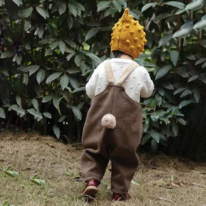 名前の通り、うさぎちゃんのしっぽがついてます。後ろ姿までかわいいサロペット。色味も今っぽくて使いやすいです。
