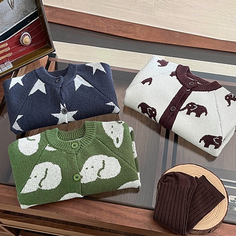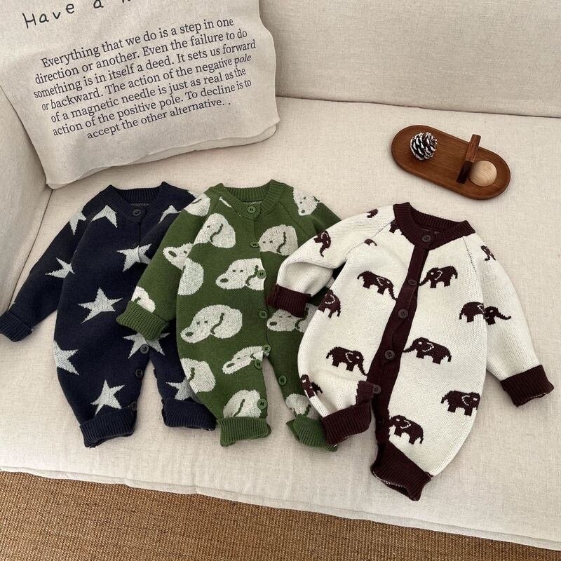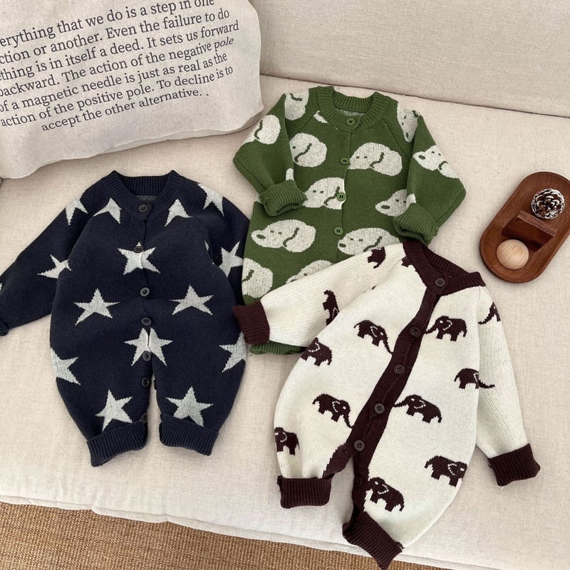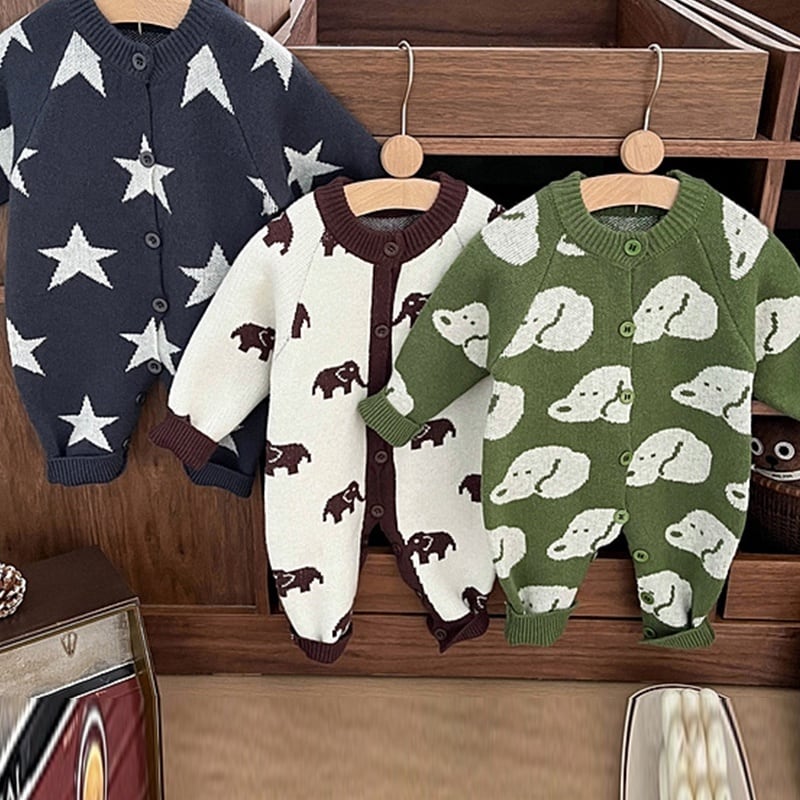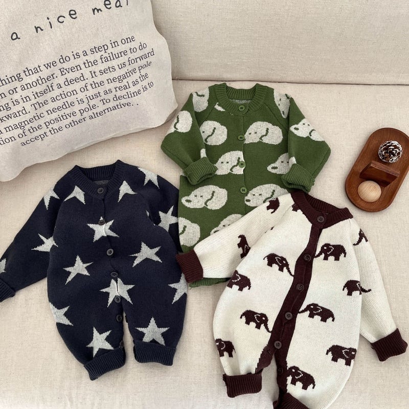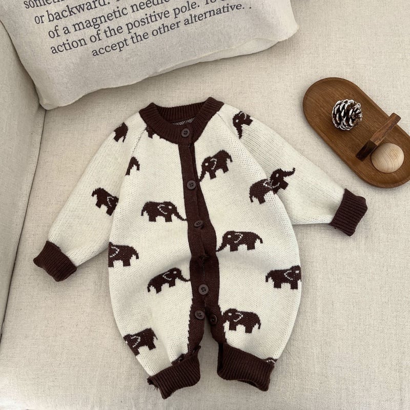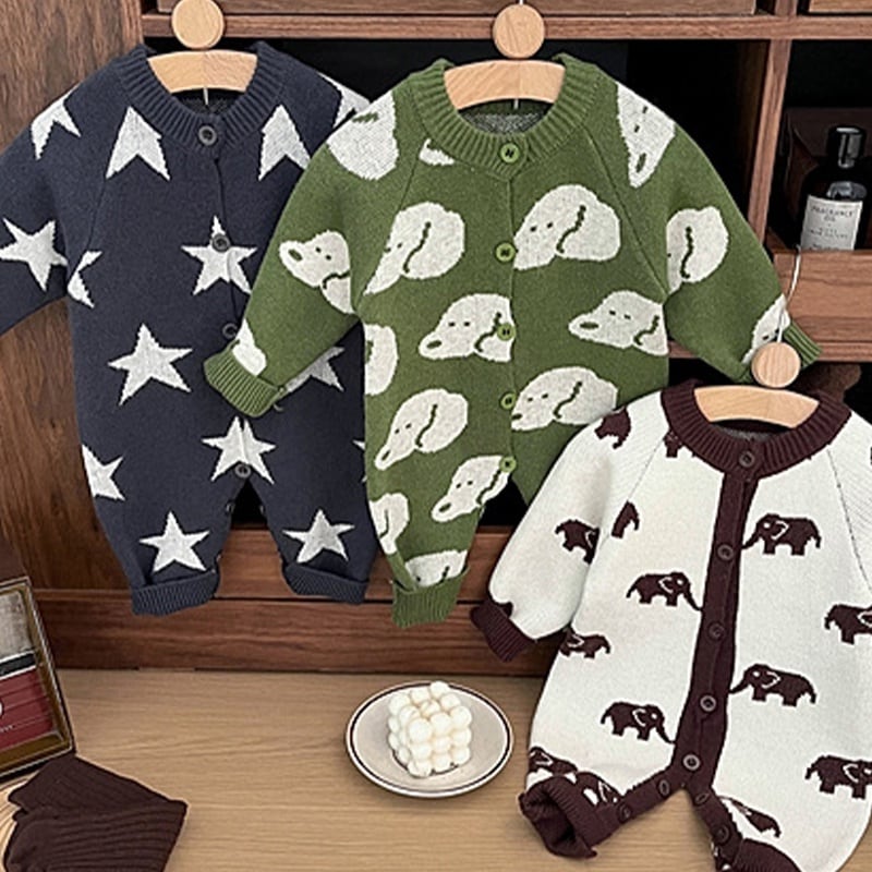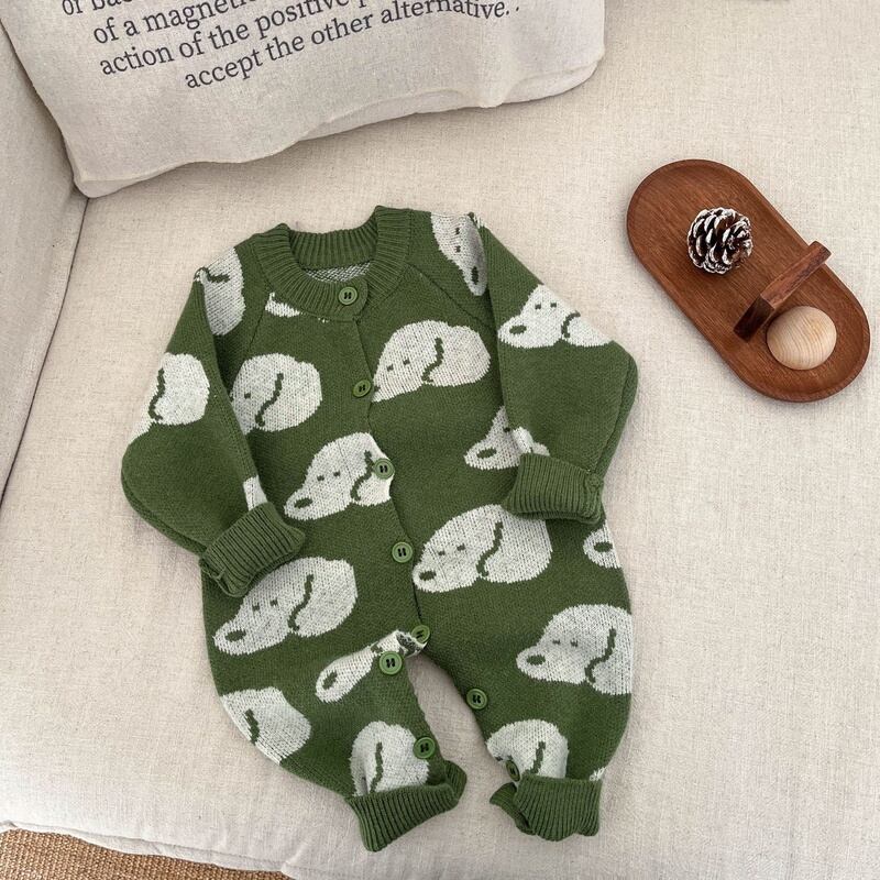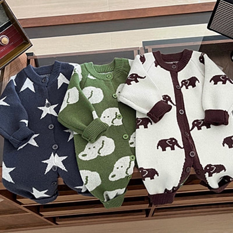 2025AWでとても人気だったニットロンパースの春バージョン。動物プリントがかわいい。