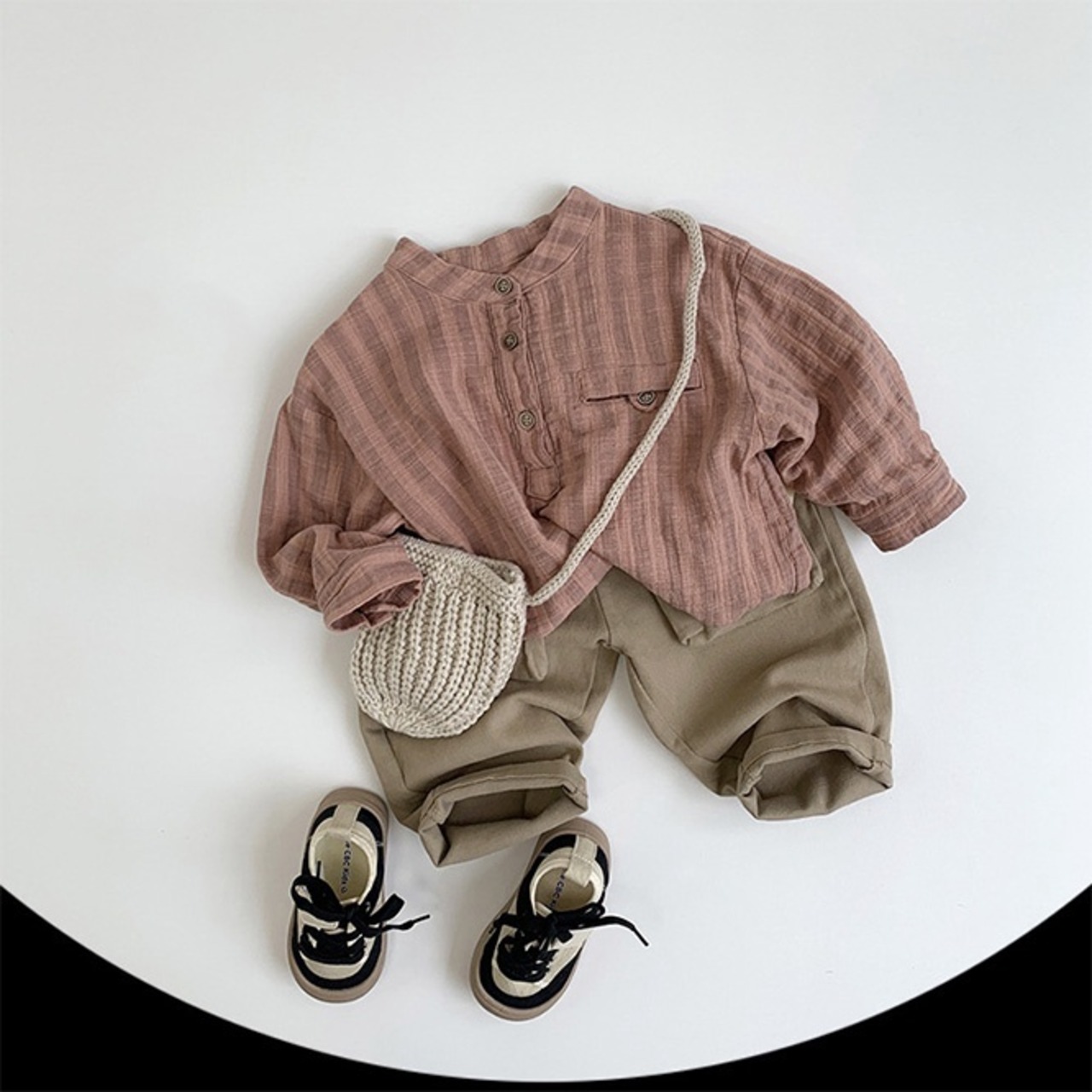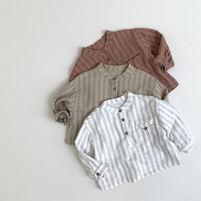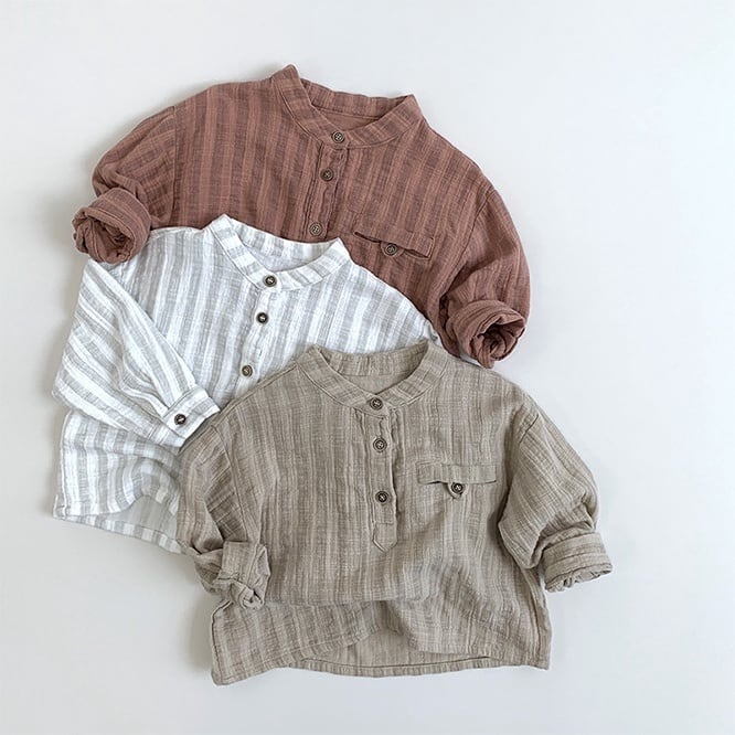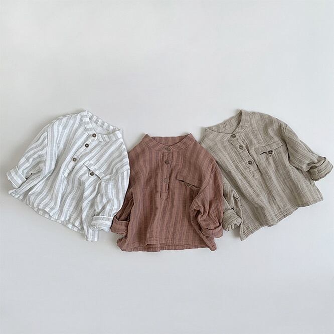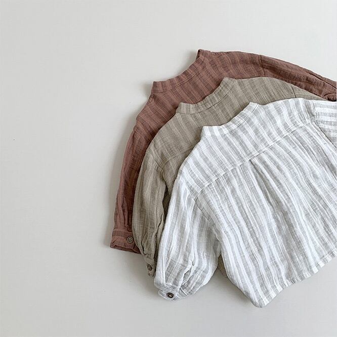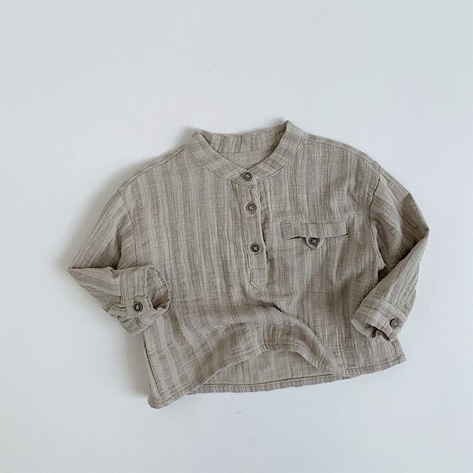 くすみカラーがとてもかわいいバンドカラーブラウス。性別関係なく着こなしてほしいアイテム。