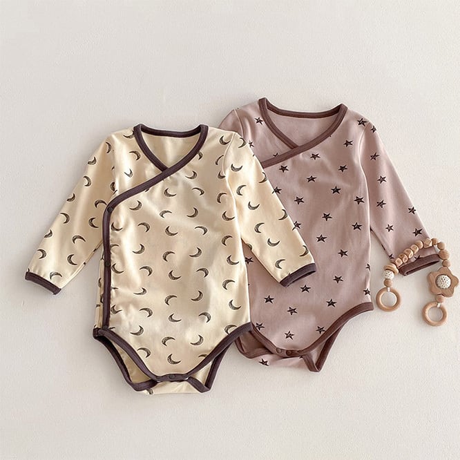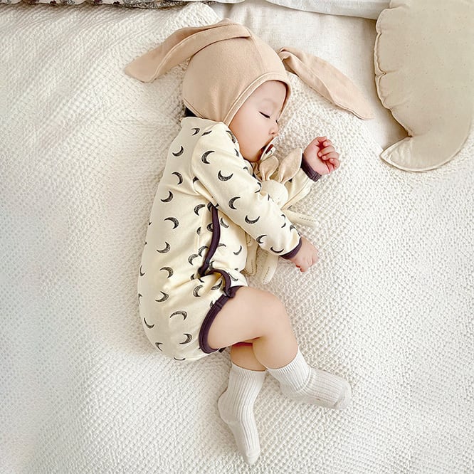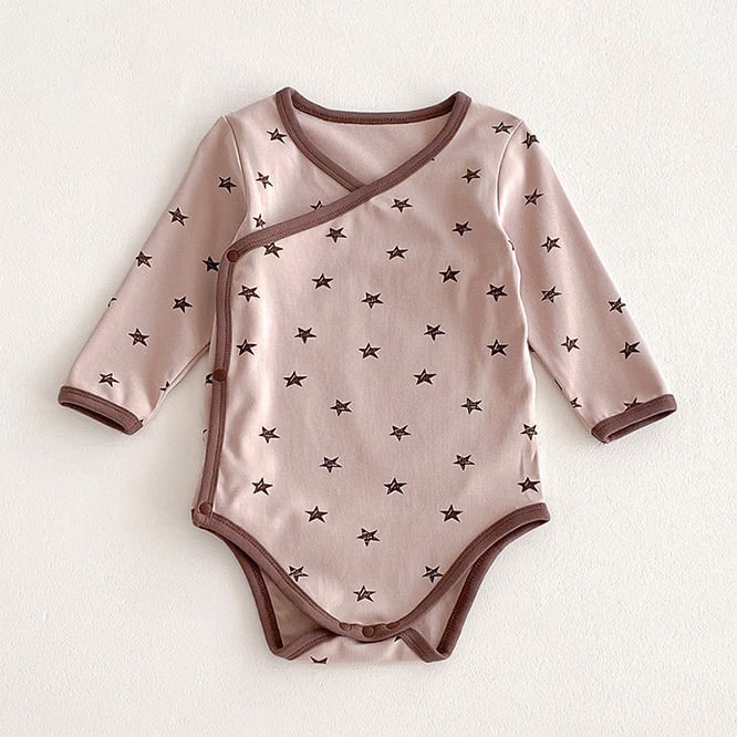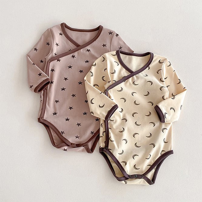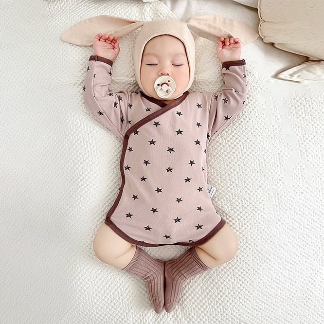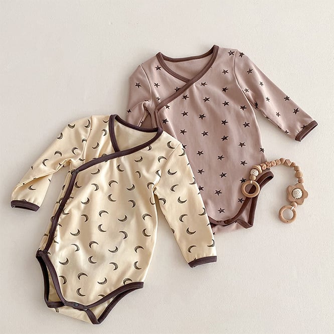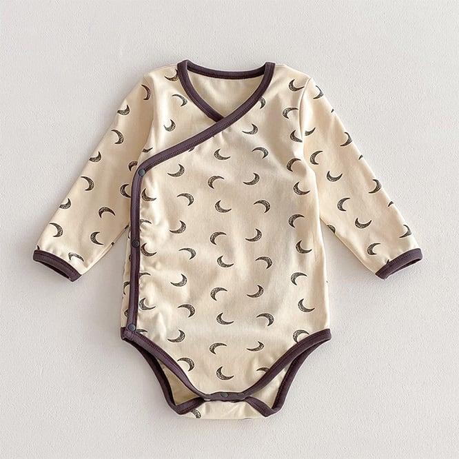 パイピングと色味がとてもマッチしたロンパース。前開きなので着脱も楽ちん。