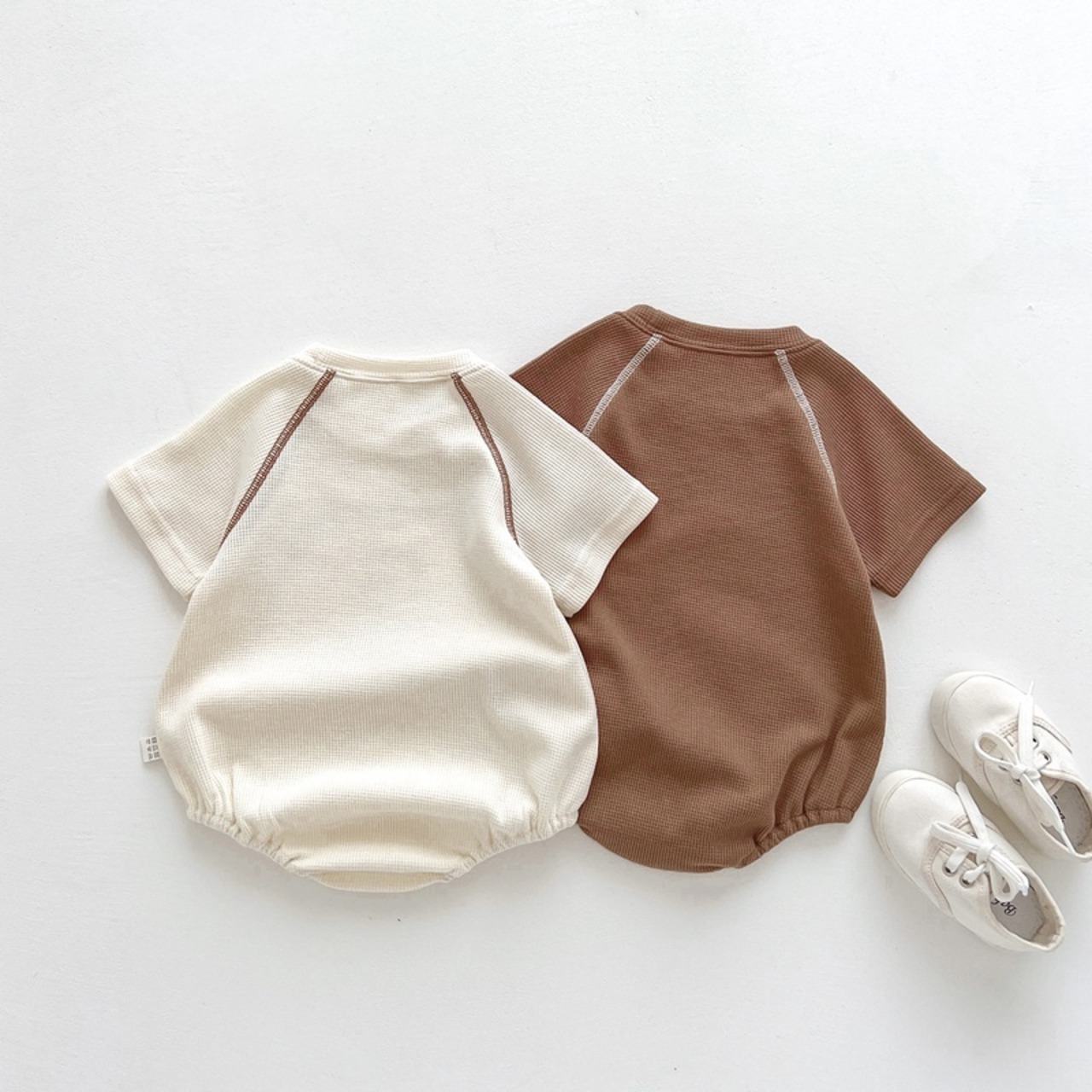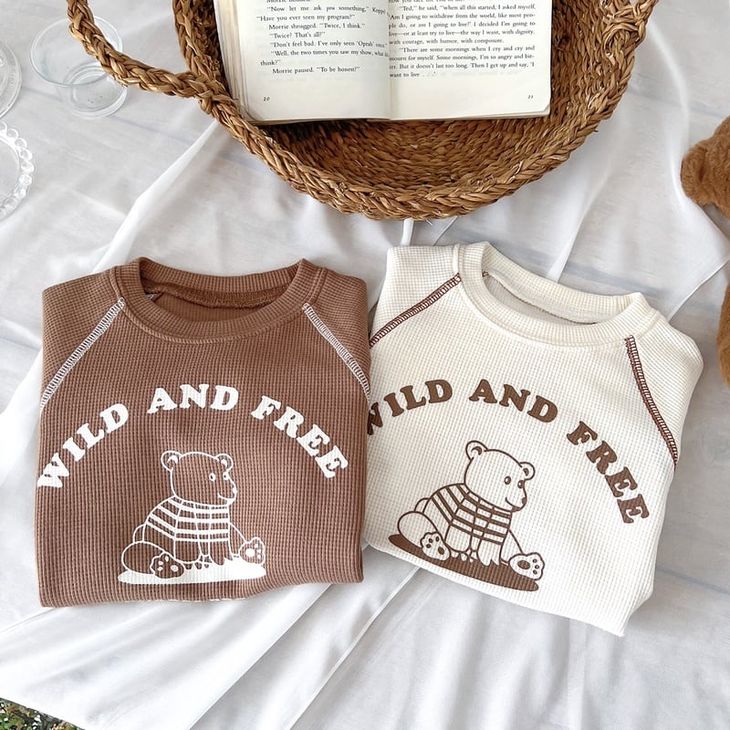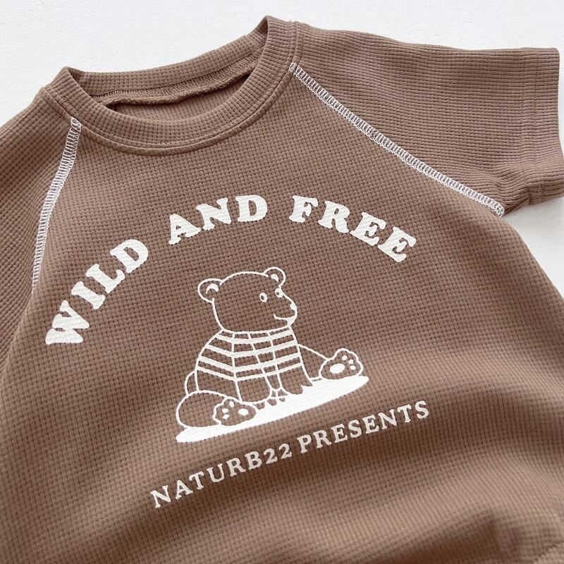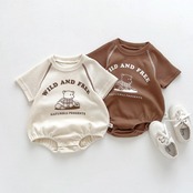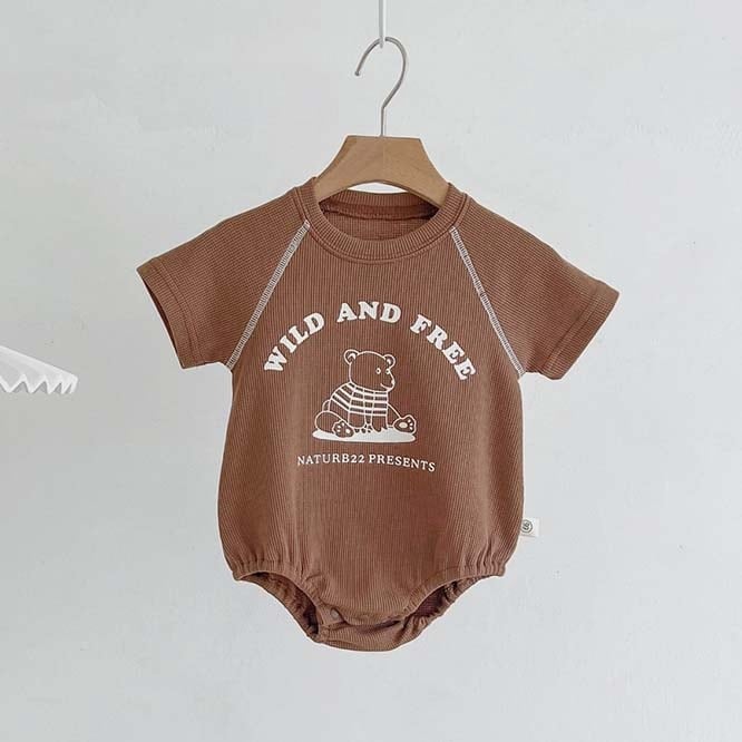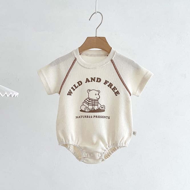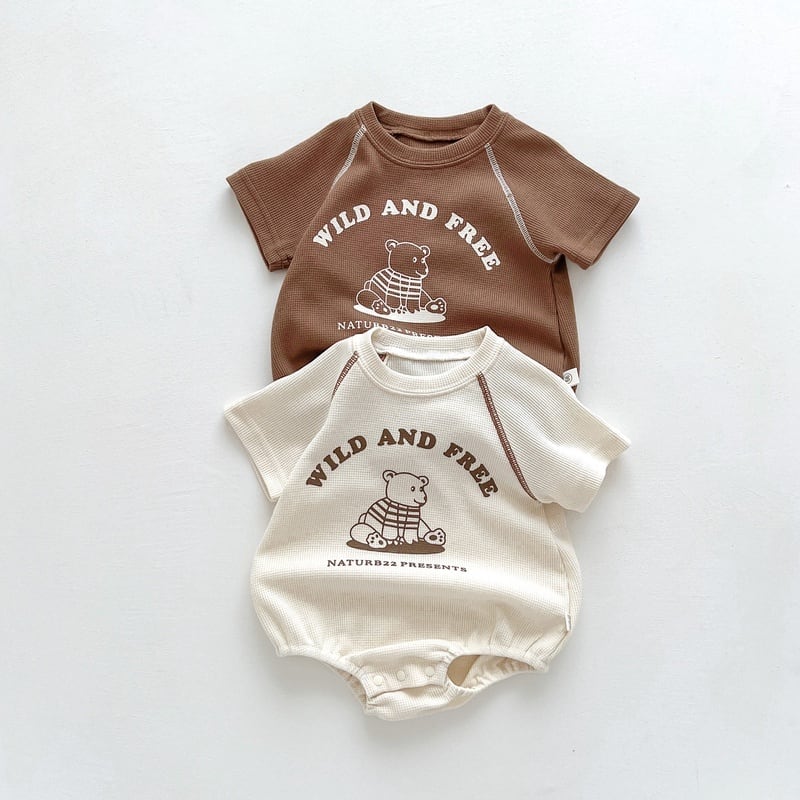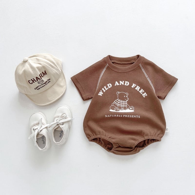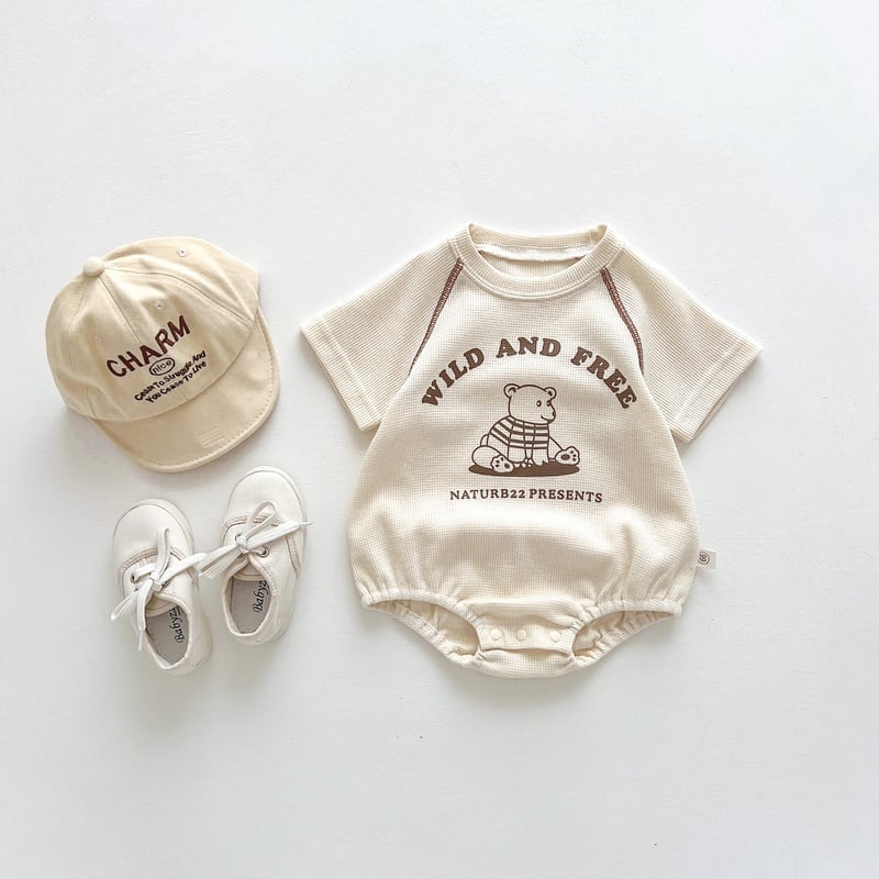 くまさんのプリントがポップだけど、ナチュラルな雰囲気のロンパース。
