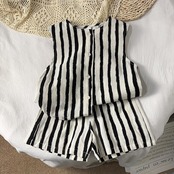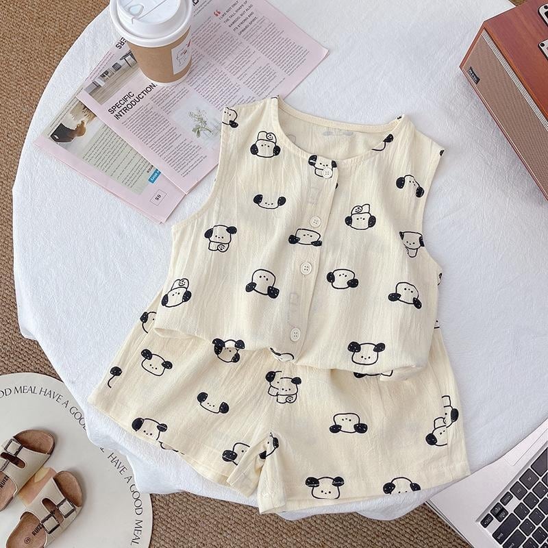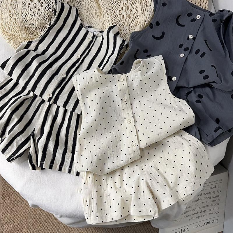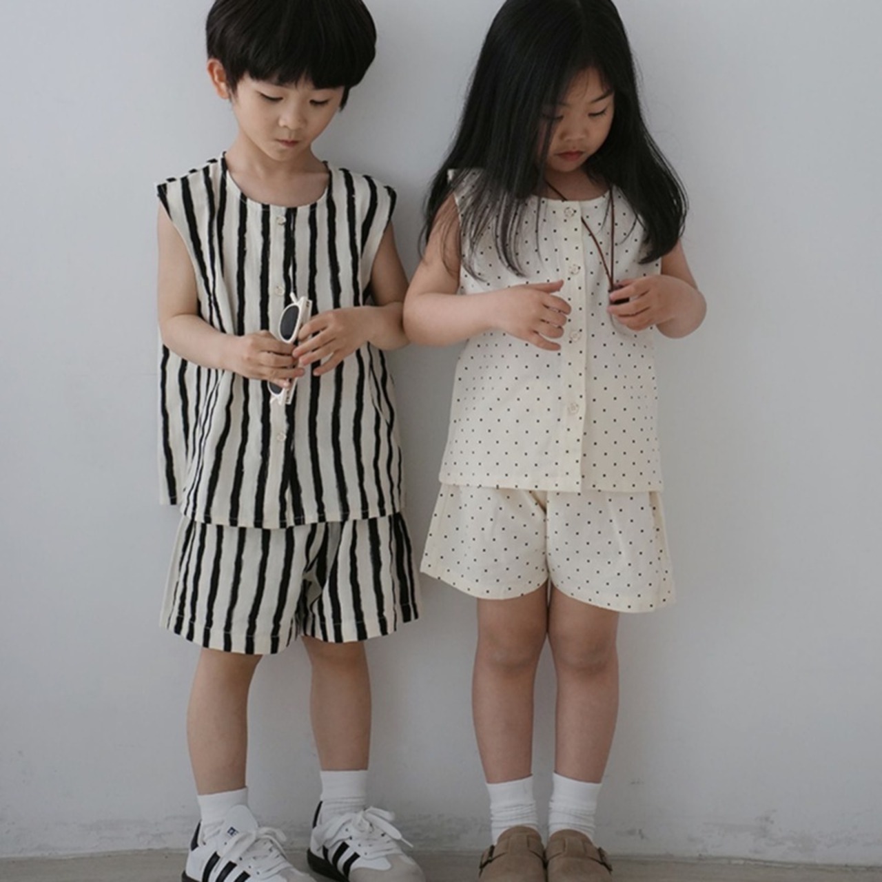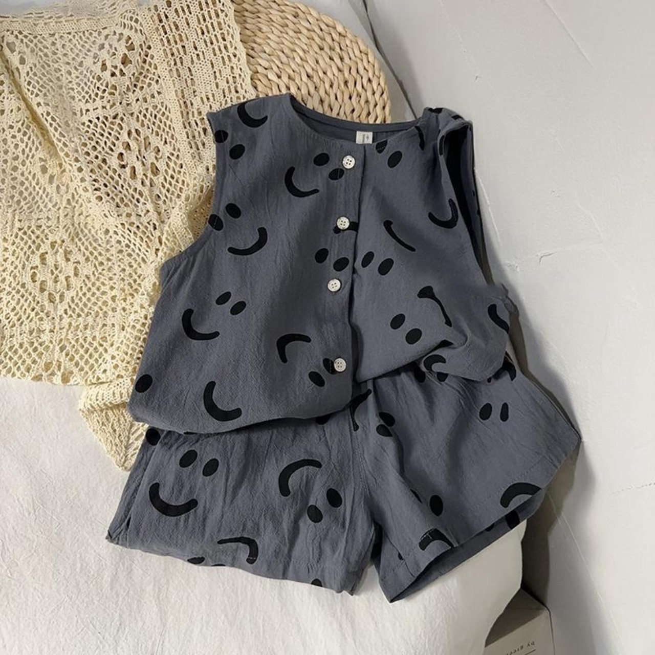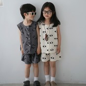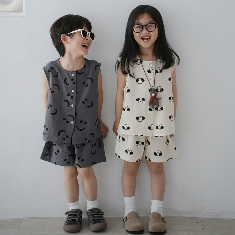 それぞれの柄がシンプルだけど特徴的でかわいいセットアップ。暑い夏場はこういうのに限る。