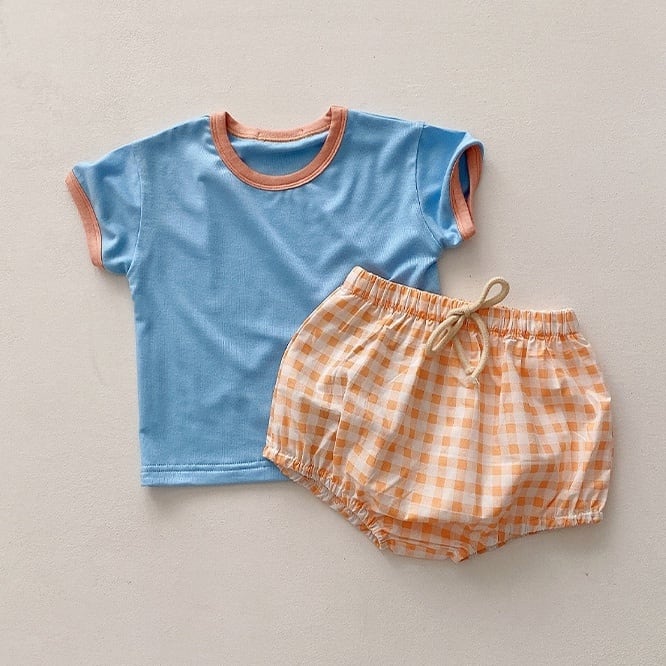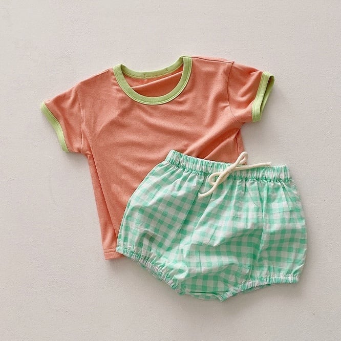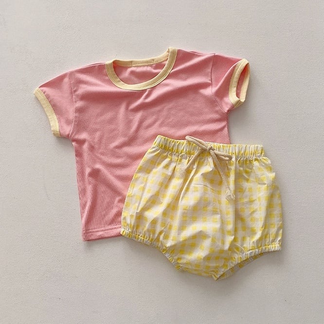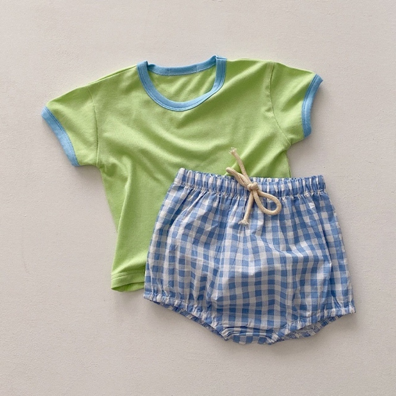 カラフルで気分まで楽しい気持ちになるセットアップ。色味の合わせがポップでかわいいです。